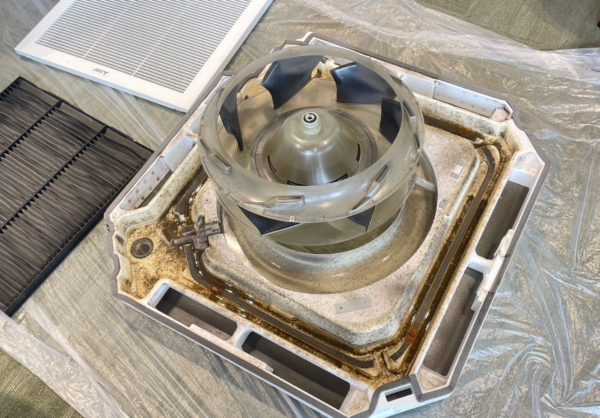 プロによる清掃では、フィルターだけでなく、熱交換器・ファン・ドレンパンまで徹底洗浄するため、