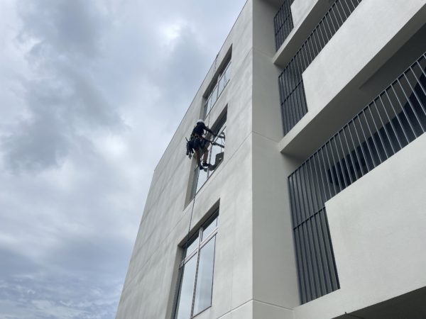 ロープ作業による高所ガラス清掃