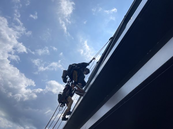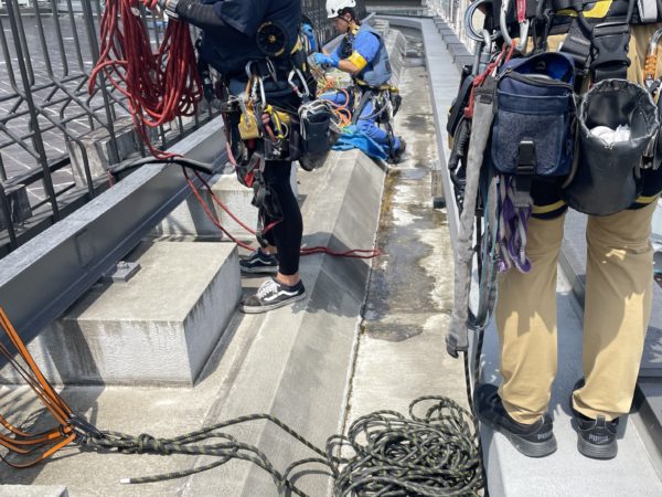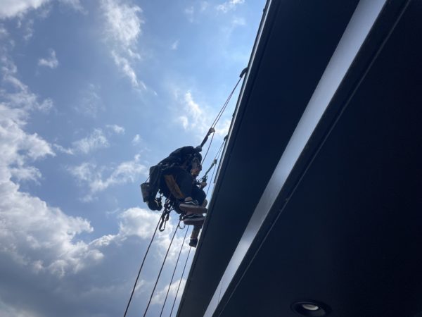 屋上からのロープ作業で7,8階の外側ガラス清掃を行いました