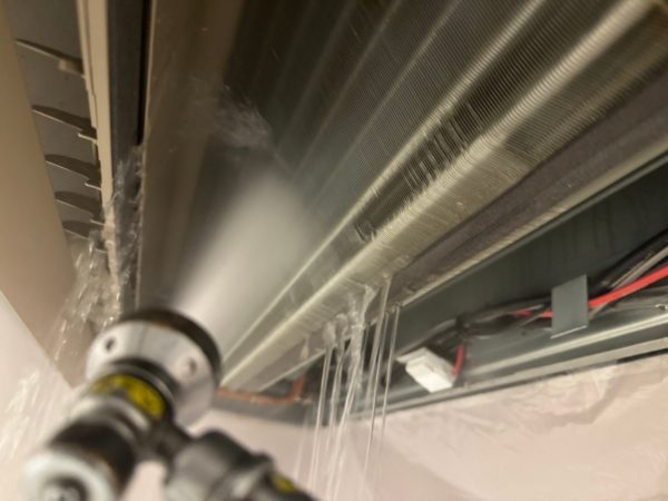 そして、熱交換器部分に洗浄用の薬品を噴霧していきます。