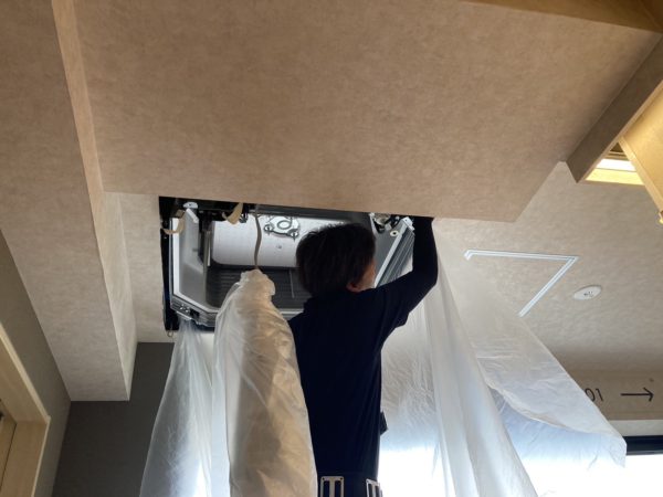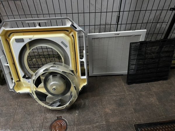ケーシング→基盤→ドレンパン→ファンの順に脱着を行い、別の場所で洗浄を行います。
