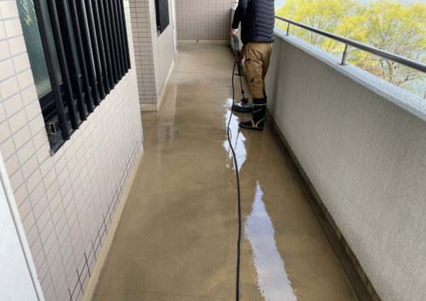 床面は飛散防止カバー付きの高圧洗浄機を使って洗浄しました。