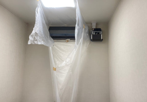 本体は更に養生を行い、熱交換器部分に洗浄用の薬品をまんべんなく吹き付けます。