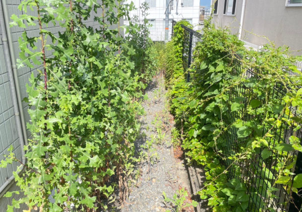 写真のように、背丈ほどの草が生え、フェンスにはツルが絡み付いてます。