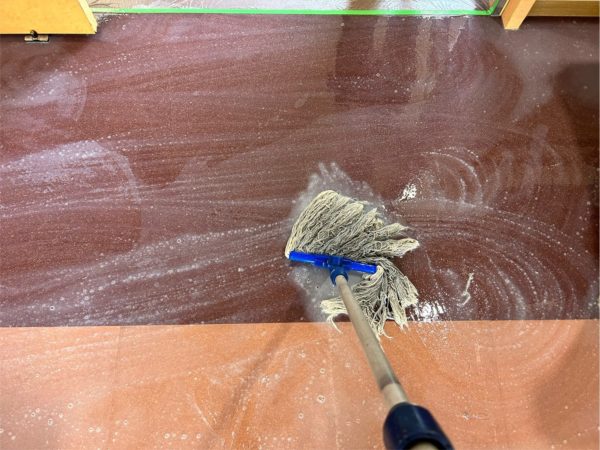 ポリッシャー掛けが終了したら、モップを使って清拭き(せいしき)を行い、ワックス剤塗布の準備を行います。