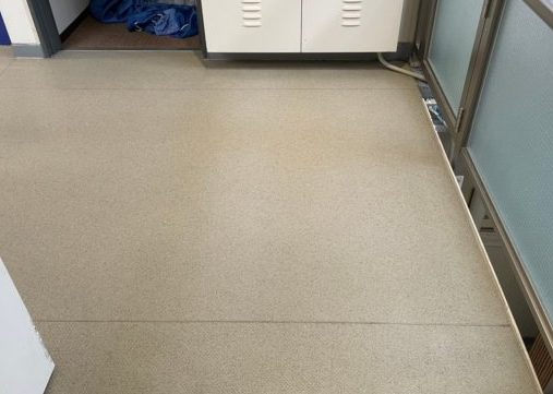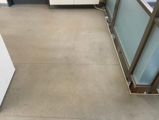 床材にはエンボス床(ノンスリップ床材)が使用されており、屋外と通じていることもあって汚れが目立ってしまっていました。
