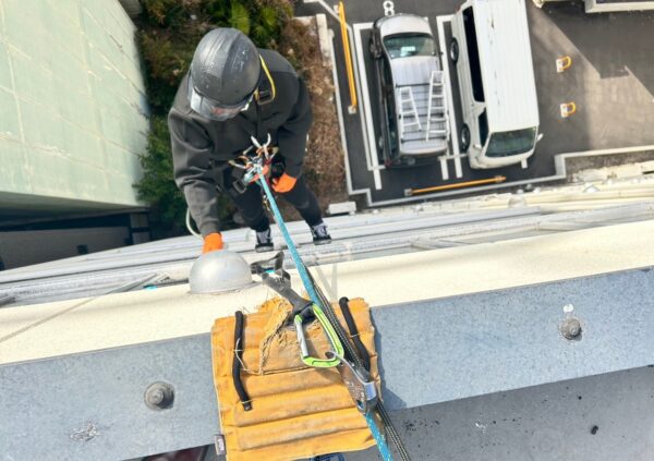 まず初めに屋上からメインロープ・補助ロープを設置します。
