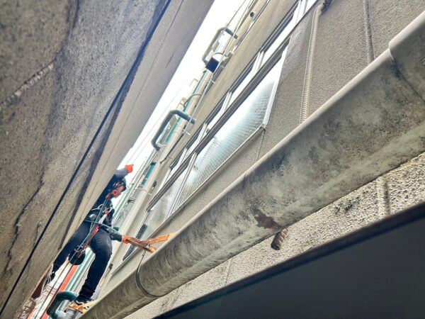 そのため、屋上からロープを使用して外側の清掃を実施しました。