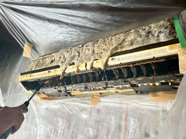 これは内部のカビが原因ですが、プロは高圧洗浄や薬剤を使って除菌・消臭まで行います。