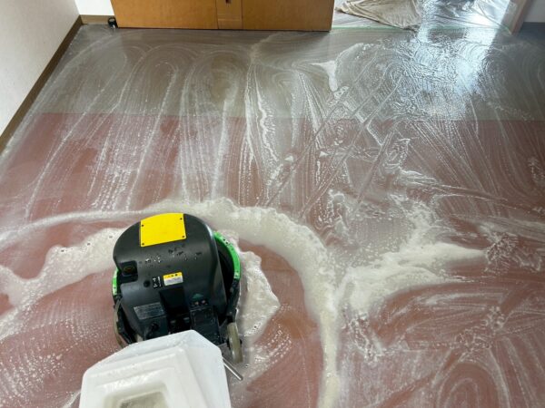 汚水を回収し、再度、水のみでポリッシャーがけを行い、