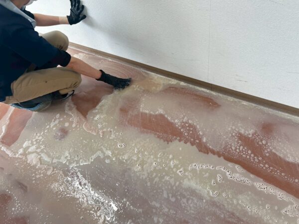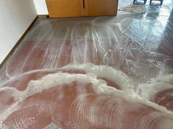 剥離剤を塗布したのちしばらく時間を置くと、ワックスと汚れが浮いてくるので、