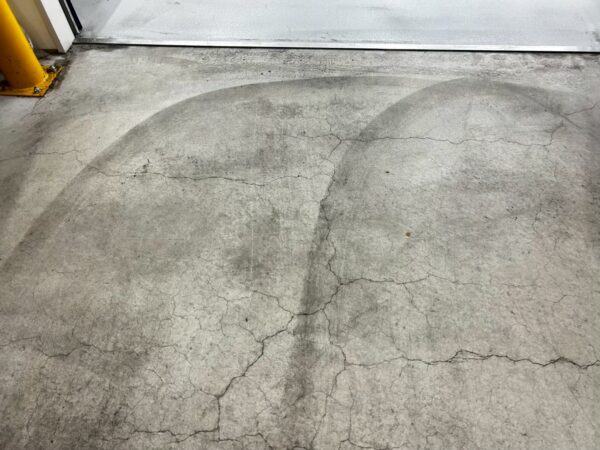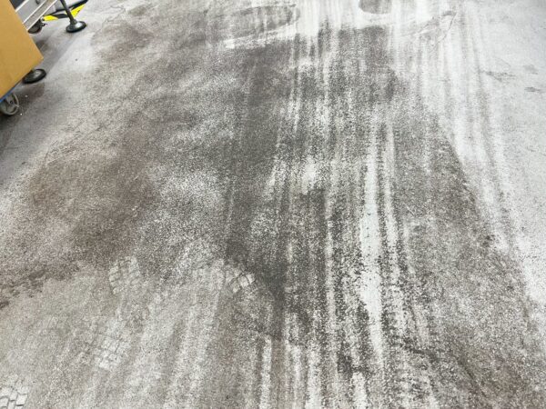 コンクリートは一見乾いていても、油分や粉塵が溜まると非常に滑りやすくなります。
