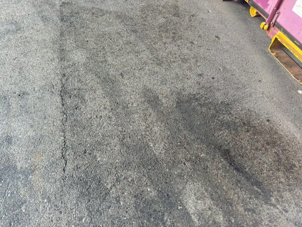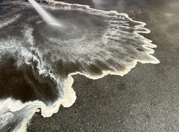 道路アスファルトの オイル汚れ除去作業|温水高圧洗浄で頑固な油汚れを徹底除去!